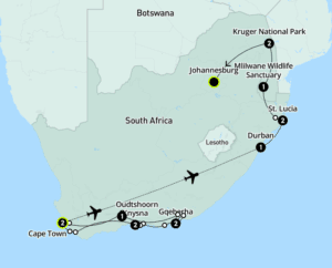 Ontdek de Tuinroute, spot nijlpaarden en kampeer onder de sterren in het Kruger Nationaal Park. Het strand-, stads- en safarileven staan hoog op de agenda tijdens deze fantastische reis!